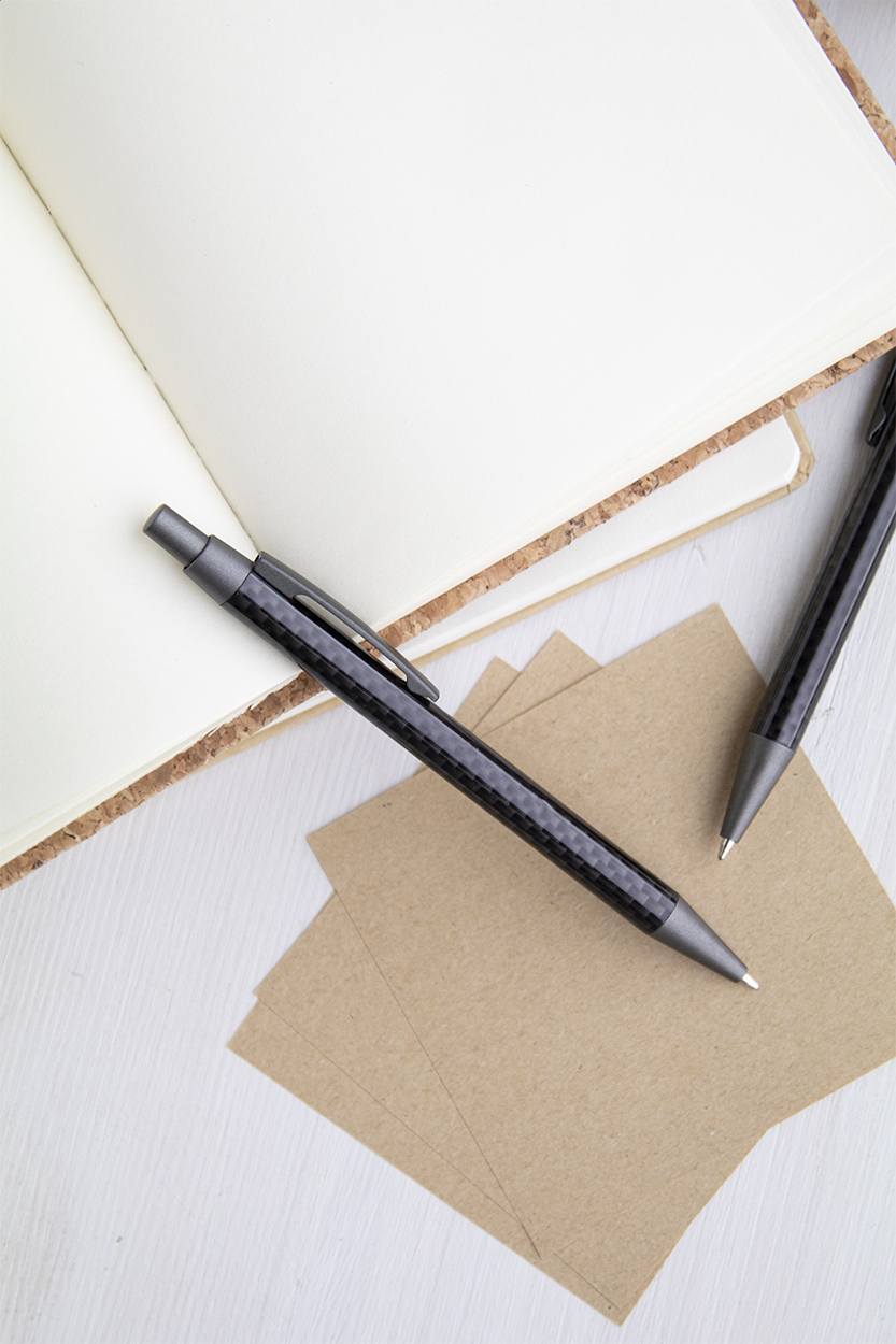 Metall-Kugelschreiber mit Gehäuse in Carbonoptik, blauschreibend, in schwarzem Pappetui.