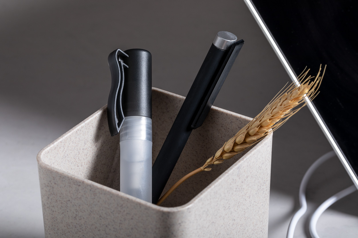Multifunktionaler Stifteköcher Ampdesk bedruckt mit Logo und kurzfristig lieferbar.